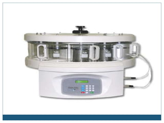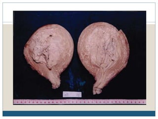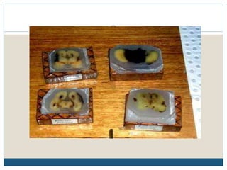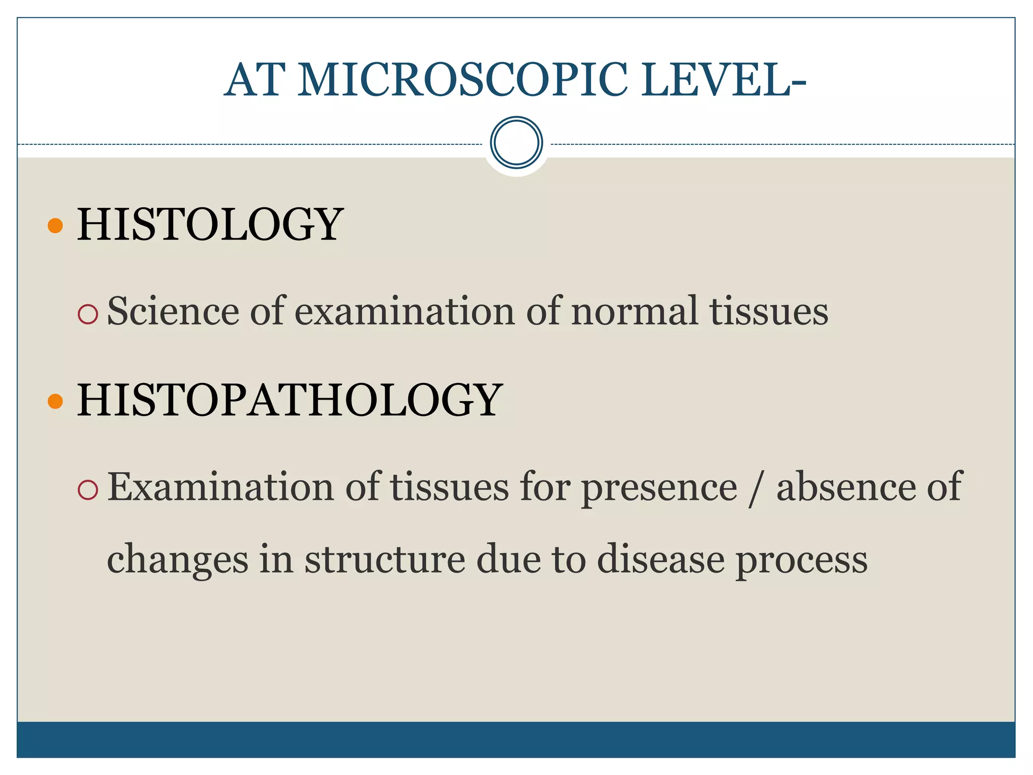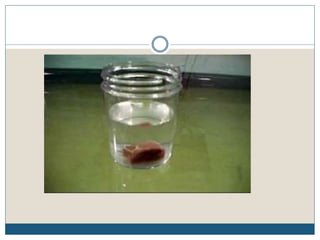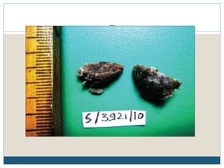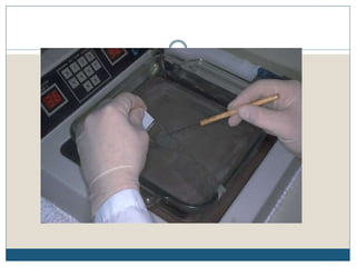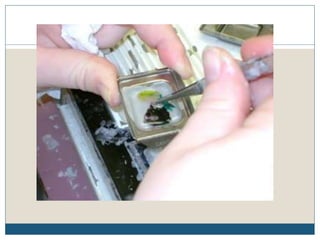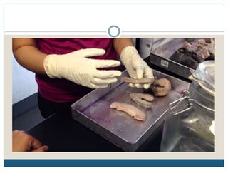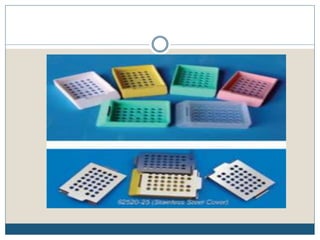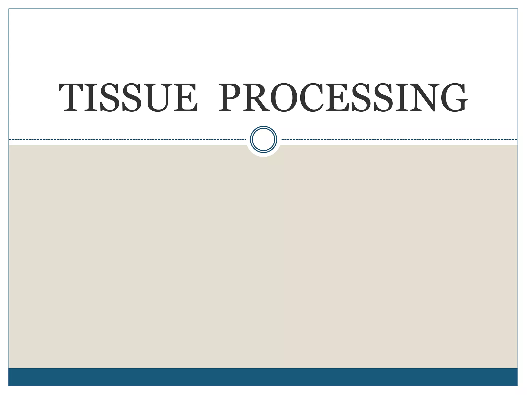 This document describes the process of tissue processing for microscopic examination. Tissue samples are first fixed in formalin to prevent decomposition. They are then dehydrated by passing through increasing concentrations of alcohol, cleared using xylene to remove the alcohol, and infiltrated with paraffin wax. The tissues are embedded in wax blocks and sectioned using a microtome. The sections are stained, most commonly with hematoxylin and eosin, which stain nuclei purple and cytoplasm pink. This allows examination under a microscope.
