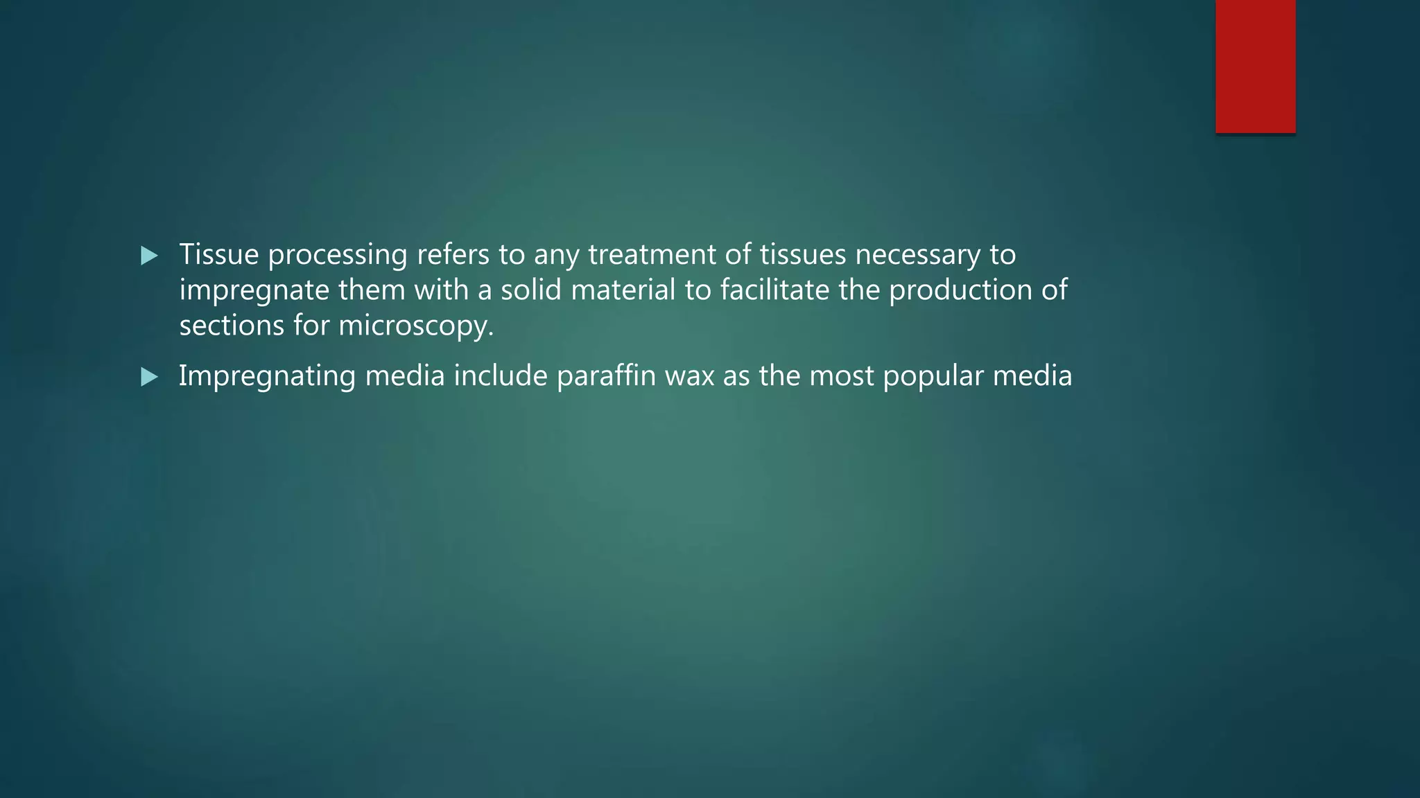 Tissue processing involves treating tissues to impregnate them with a solid material like paraffin wax to facilitate microscopic sectioning. Proper identification, fixation, and any special post-fixation treatment is important. The goal of tissue processing is to embed tissues in a solid media for support, rigidity for sectioning, and minimal damage. Key steps are completion of fixation, dehydration, clearing, and embedding. Factors like agitation, heat, viscosity, ultrasonic, and vacuum can affect the rate of fluid penetration and impregnation during processing.