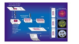 This document discusses the process of tissue processing for histological examination. It involves several key steps: specimen identification and labelling, gross examination, fixation, dehydration, clearing, infiltration, embedding, sectioning, and staining. Fixation using formalin or other fixatives preserves tissue structure. Dehydration removes water and replaces it with alcohol or other solvents to allow for infiltration of paraffin wax. The wax infiltrates and impregnates the tissue, allowing it to be sectioned thinly for microscopic examination after staining. The document provides details on common fixation and processing methods and their purposes in preparing tissue for histological analysis.