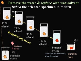 2. Key steps include fixation of tissues using formalin to preserve structure, dehydration using increasing concentrations of alcohol, clearing with xylene, impregnation and embedding in paraffin wax.