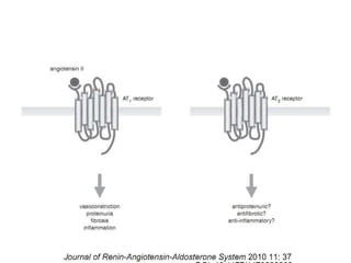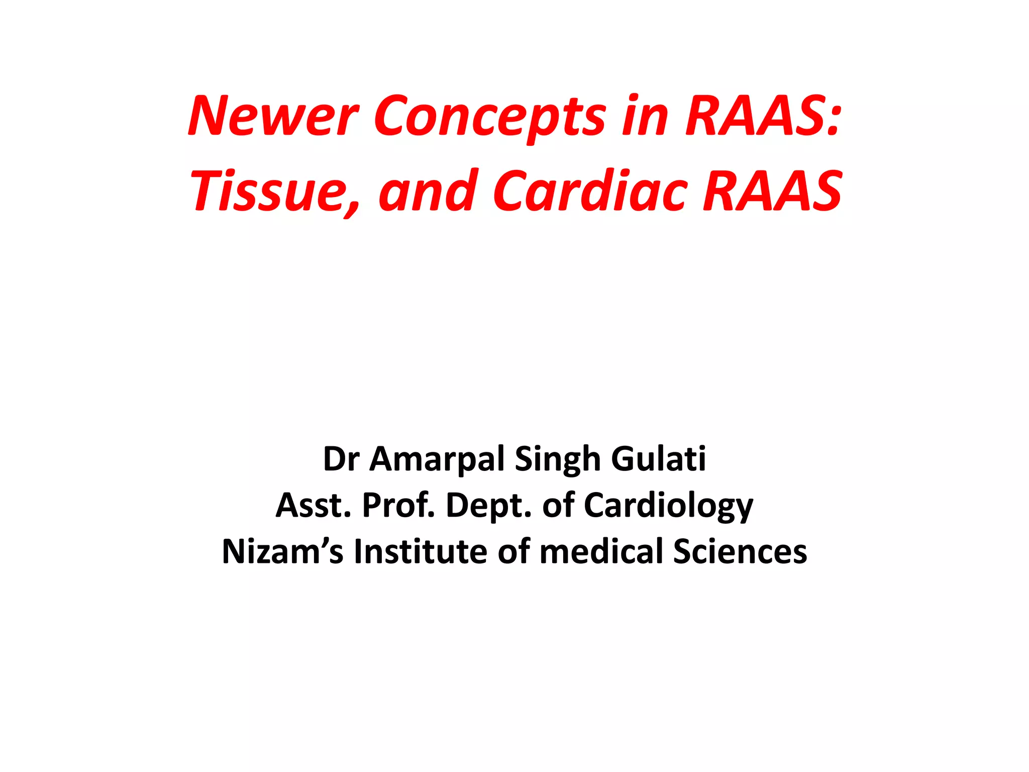 This document discusses newer concepts in the renin-angiotensin-aldosterone system (RAAS), including tissue and cardiac RAAS. It describes how the RAAS was traditionally viewed as circulating in the bloodstream, but is now understood to also exist locally in tissues. Local tissue RAAS can generate angiotensin II independently of circulating RAAS through local synthesis of angiotensinogen and renin. Inhibition of tissue RAAS provides benefits like reducing endothelial dysfunction, vascular damage, and organ damage in the heart and kidneys.