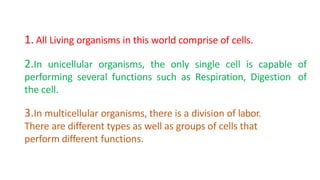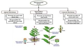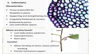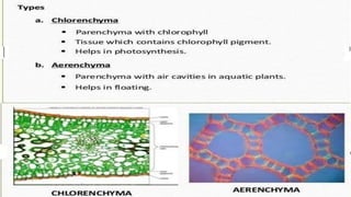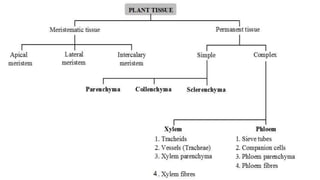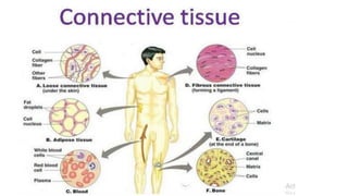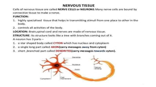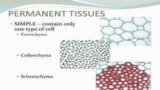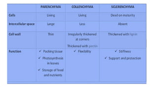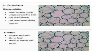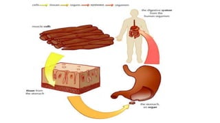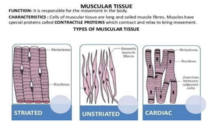 The document discusses the composition and types of tissues in living organisms, highlighting the division of labor in multicellular organisms. It distinguishes between plant and animal tissues, explaining their functions, structures, and the roles of different cell types in each. Additionally, it covers specific tissue types such as meristematic, connective, and muscle tissues, along with their functions and characteristics.