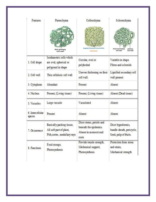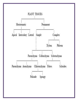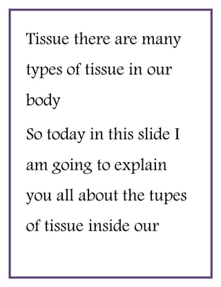 This document discusses the different types of tissues found in the human body and how they compare to plant tissues. It explains that there are four main types of animal tissue - epithelial, muscular, connective, and nervous tissue - and that these perform different functions than plant tissues which are made up of meristematic and permanent tissues. The document aims to explain the differences between plant and animal tissues.
