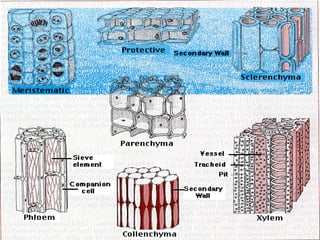 Plant tissues are divided into meristematic and permanent tissues. Meristematic tissues are undifferentiated and can divide to form new cells, found in regions of growth. Permanent tissues are differentiated and consist of simple tissues like parenchyma, collenchyma and sclerenchyma, and complex tissues like xylem and phloem that transport water/minerals and food respectively. Special tissues include protective epidermis and cork tissues that provide protection to plants.
