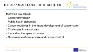 This document discusses strategies for cancer screening and early detection, particularly for men. It identifies key topics such as cancer prevention, public health genomics, cancer registries, challenges in cancer care, and innovative therapies. It emphasizes the importance of encouraging screening and early detection for men through positive messages and identifying socially vulnerable groups. Challenges include developing approaches to increase preventative activities for men and identifying gaps through screening and early detection. Both screening and early detection are important but screening requires evidence of population-level benefits and not all cancers can be screened for. Early detection may encourage hesitant individuals and acknowledge the cancer issue. Current challenges include a lack of guidelines leaving room for variation and not adequately risk stratifying or involving primary care.