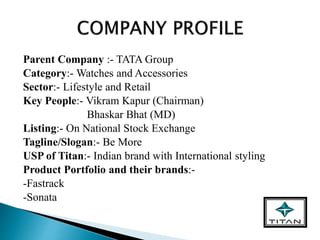 Titan, a part of Tata Group, is positioned in the lifestyle and retail sector, specializing in watches and accessories aimed at the mid to premium market. The brand focuses on creating stylish timepieces while maintaining a culture of innovation and corporate social responsibility, targeting underprivileged youth and Indian heritage. Despite facing competition and brand image challenges, Titan has opportunities for expansion in a growing Indian market and potential global partnerships.