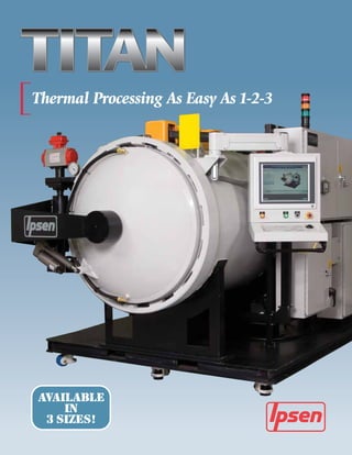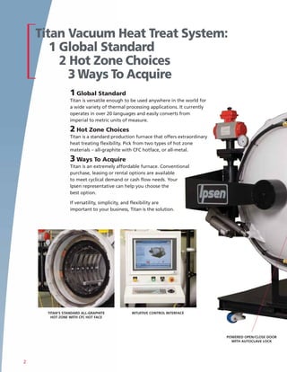 The document provides information about the Titan Vacuum Heat Treat System. It offers 3 sizes and flexibility in acquisition options. Key features include versatility for various applications worldwide, easy operation, and affordability. It can accommodate different load configurations and provides a simple, compact solution for heat treating needs.