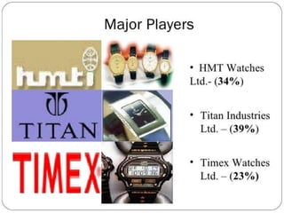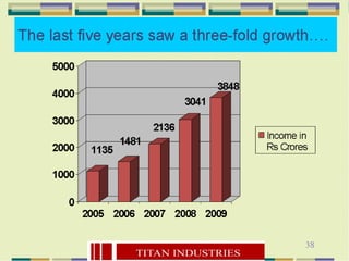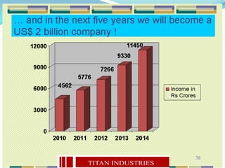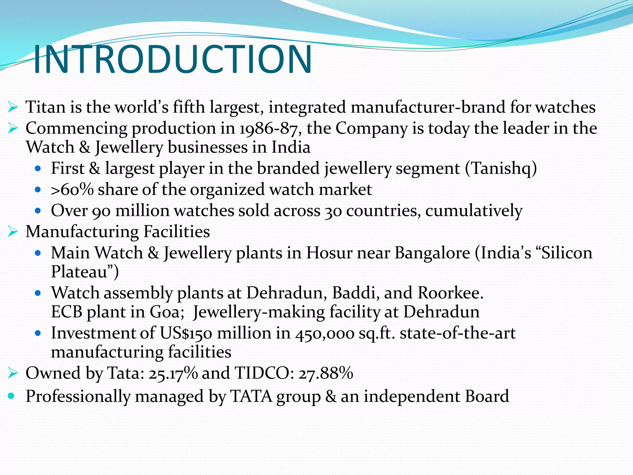 Titan is India's largest manufacturer of watches and jewellery. It has manufacturing facilities in Hosur, Dehradun, Baddi, Roorkee, and Goa. Titan produces over 12 million watches per year under brands like Titan, Fastrack, Sonata, and Xylys. Its jewellery brand Tanishq is the largest jewellery brand in India. Titan also has eye wear and precision engineering divisions. It markets products in over 30 countries with a focus on the Middle East and Asia Pacific regions. Titan is part of the large Tata Group and aims to expand its product portfolio and global presence further.