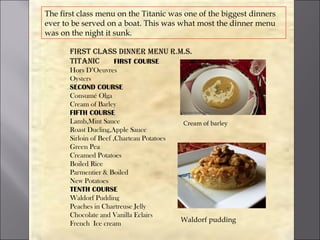 The Titanic sank on April 15, 1912 after colliding with an iceberg. Of the estimated 2,224 passengers and crew on board, more than 1,500 died in the disaster. Some key facts about the Titanic include that it had an luxurious first class dinner menu, there were not enough lifeboats for all onboard leading to many empty lifeboat seats, and various passengers stories are described such as Mr. Caldwell who survived with his family.