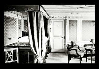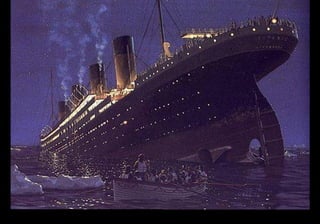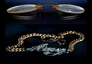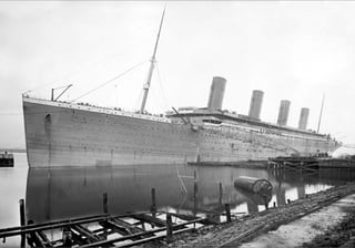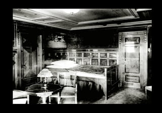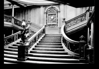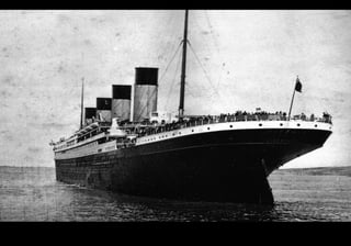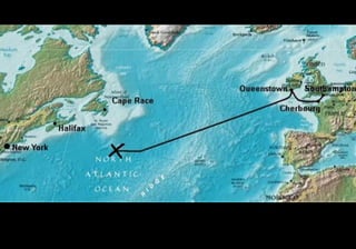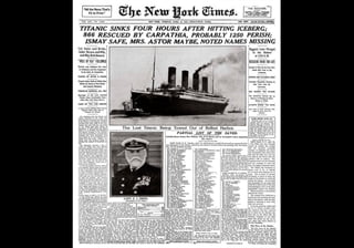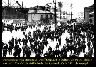 This document provides photographs and details from the Titanic's construction in Belfast in 1911 through its fateful maiden voyage and sinking in 1912. It describes the Titanic departing Belfast for sea trials before beginning its transatlantic crossing. On the night of April 14th, the Titanic struck an iceberg and began sinking, with the bow flooding and the stern rising up until the ship broke in two. Survivors were rescued by the Carpathia and brought to New York, where they were interviewed by reporters. Decades later, artifacts from the wreckage of the Titanic were recovered and put on display, memorializing the infamous ship.