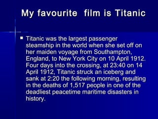 The document provides details about the 1997 film Titanic directed by James Cameron. It describes how the film tells a fictional love story set during the sinking of the RMS Titanic in 1912. Cameron aimed to depict the sinking as accurately as possible, including showing the ship breaking in two. Extensive sets and special effects were used to recreate scenes on the ship and in the ocean. The film was a major commercial success and won numerous awards. Its soundtrack, including the song "My Heart Will Go On" by Céline Dion, also achieved huge popularity.