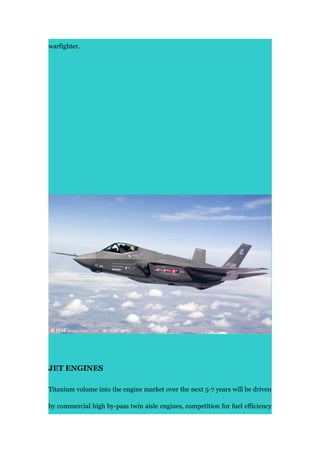 The document discusses the rising demand for titanium in military and aerospace applications due to its superior properties. It highlights the intense competition in the commercial aerospace sector, prompting companies like Airbus and Boeing to adapt their strategies and supply chains. Additionally, the shift in manufacturing locations aims to enhance global competitiveness within the industry.