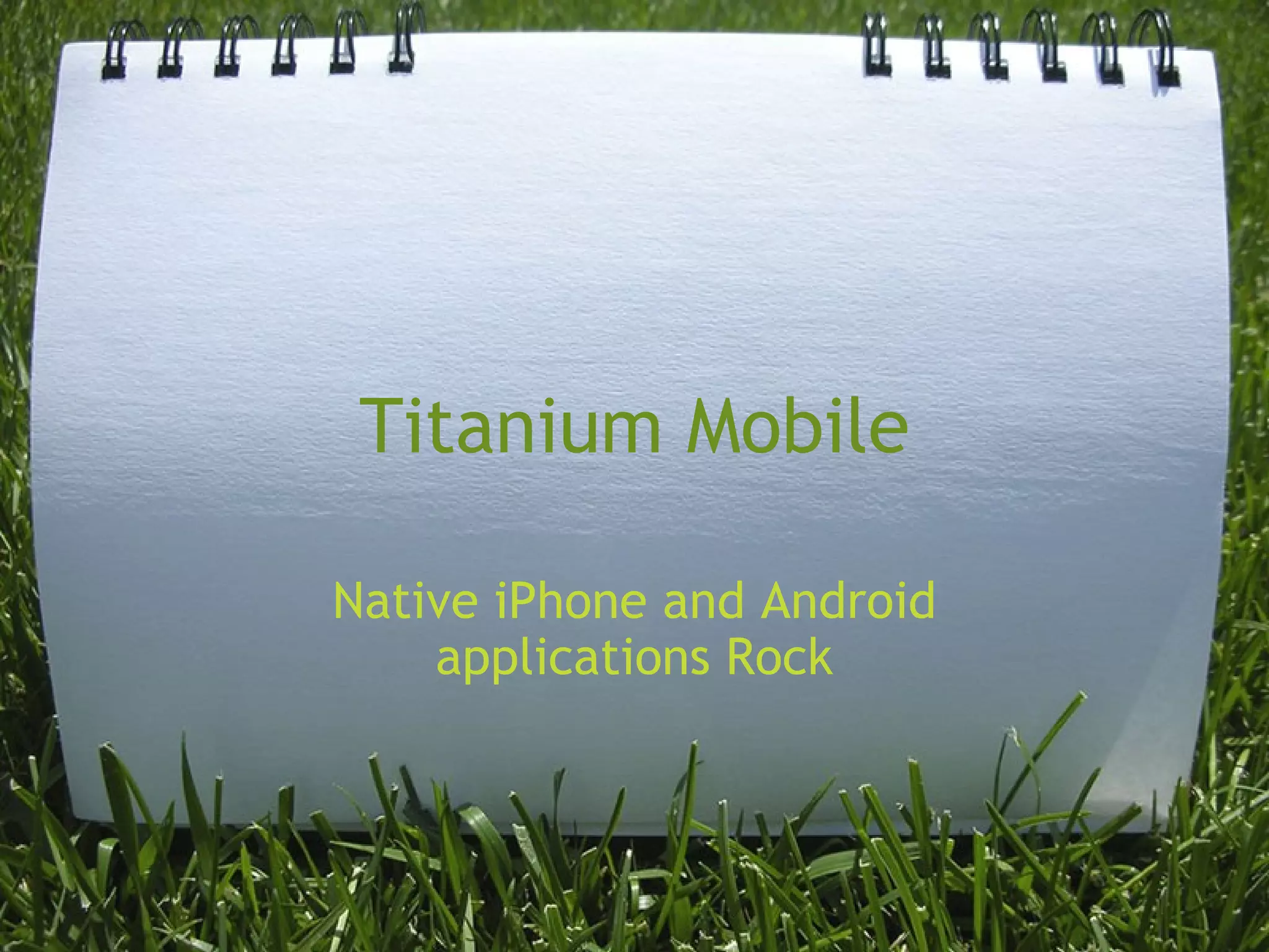 Titanium Mobile is an open source platform that allows developers to build native mobile applications for iOS and Android using HTML, CSS, and JavaScript. It includes an IDE for building projects, leverages the WebKit engine to render web content, and provides JavaScript APIs to access device functionality. Titanium improves the speed of iPhone app development significantly compared to using Objective-C.