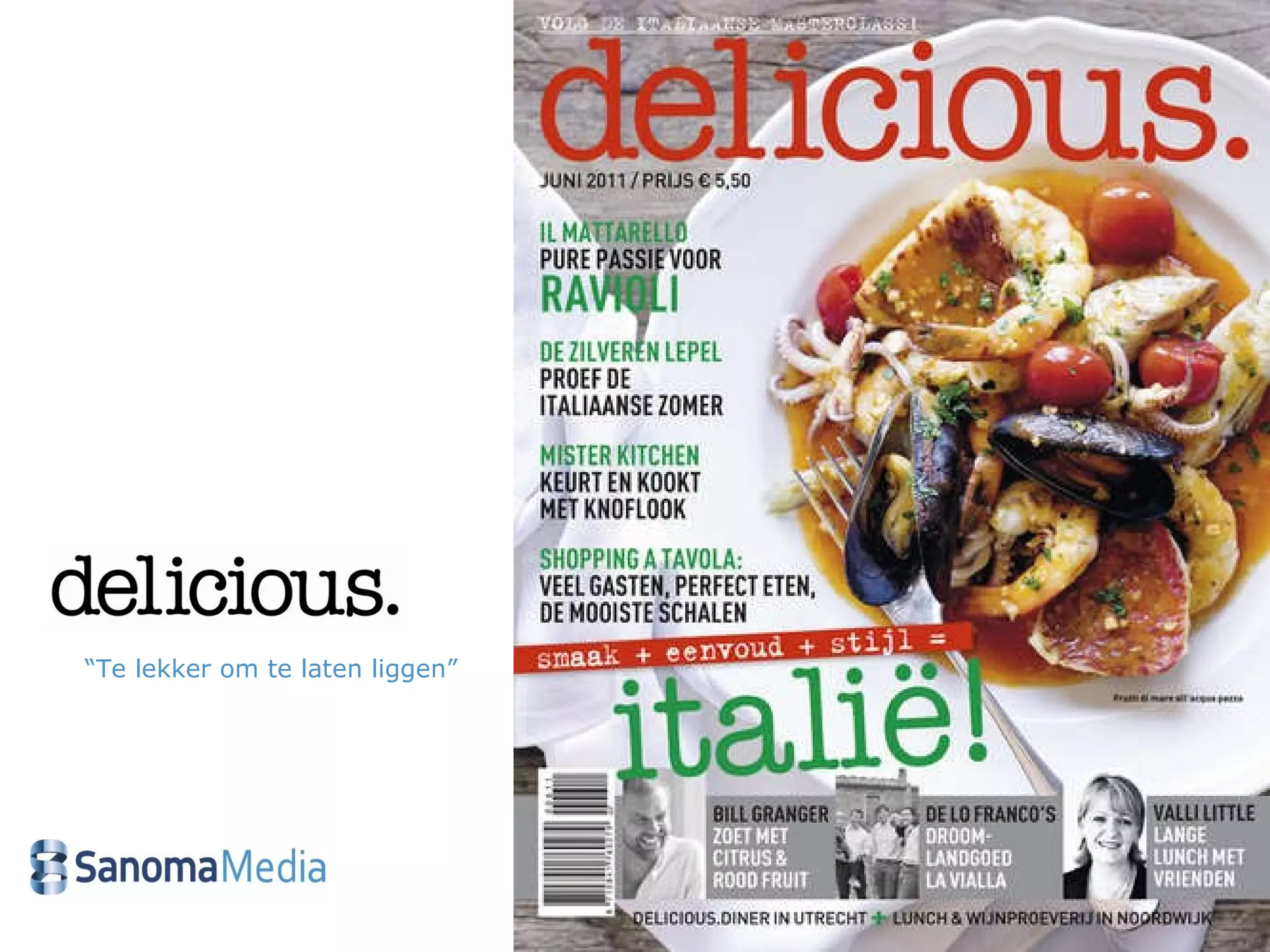 delicious. delicious.is de lekkerste glossy van Nederland. Elke maand staat delicious. boordevol overheerlijke recepten, smakelijke interviews en fijne shoppingpagina’s. Geheime culinaire adressen, verrukkelijke columns en onmisbare tips & tricks ontbreken niet. Het toverwoord van delicious. is joie de vivre. Hoofdredacteur Makkie Mulder en haar redactie doen er elke maand alles aan om eten en koken voor de lezers nóg leuker te maken. Het resultaat is een overheerlijke glossy die supertoegankelijk is. En juist daarom biedt delicious. een uniek platform voor integratie van commercie en redactie.