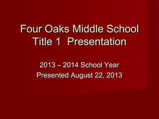 Four Oaks Middle School receives Title 1 funding from the US Department of Education to provide additional resources to students from low-income families. The funding is used to offer smaller class sizes, specialized instructional support, classroom technology and resources. Curriculum is based on the North Carolina Essential Standards and assessments include quarterly exams and annual standardized tests to monitor student progress. Parents are encouraged to participate in school activities and communicate with teachers through the school website. The presentation aims to inform parents about how Title 1 funding benefits students at Four Oaks Middle School.