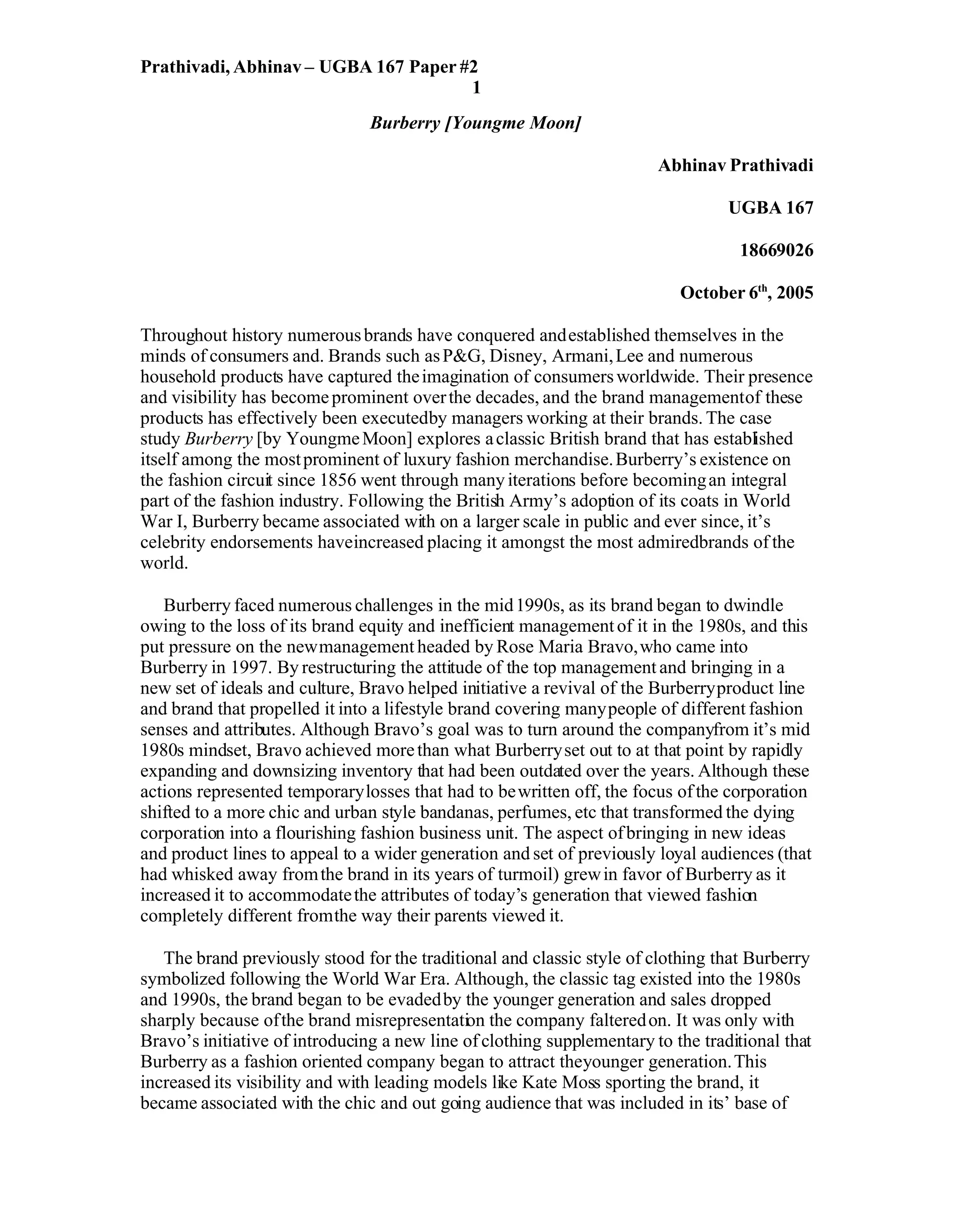 Burberry faced challenges in the 1990s as its brand equity declined due to inefficient management in the 1980s. Rose Maria Bravo was hired in 1997 to revive the brand. She restructured management, expanded product lines to appeal to younger audiences, and transformed Burberry into a lifestyle brand beyond just fashion. Bravo's initiatives helped attract new consumers and models like Kate Moss, increasing Burberry's visibility. Maintaining brand identity and distinctiveness as it expands globally will be key to Burberry's long term success.
