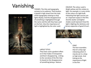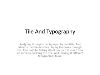 Three movie posters are analyzed for their use of title and typography to convey themes. The first poster titled "The Vanishing" uses a bright yellow color and font style resembling shop signs to represent the importance of light and a disappearing location. The second titled "Playback" uses red and white colors and a font with blood stains to signify deaths and murders related to watching something. The third titled "Jennifer's Body" uses red to represent blood and murder as well as sexuality, with a high school font style linking to its teenage setting. Different effects, colors and fonts are discussed as effective ways to convey narrative aspects through titles. The author's film title "The House of the Watched" was chosen to represent