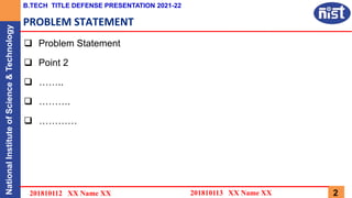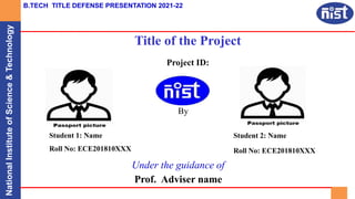 Two students, Roll No: ECE201810XXX and Roll No: ECE201810XXX, presented their B.Tech project titled "Title of the Project" under the guidance of Prof. Adviser Name. The presentation addressed the problem statement, objectives, methodology, possible outcomes, references, and concluded with a thank you.