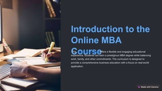 The online MBA program offers a flexible educational experience allowing students to balance work and family while earning a degree. It features a comprehensive curriculum with core courses, electives, and a capstone project, alongside benefits like affordability and global networking opportunities. Admission requires a bachelor's degree and standardized test scores, with multiple deadlines and support available throughout the application process.