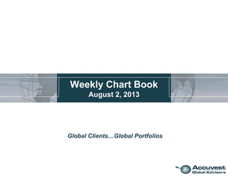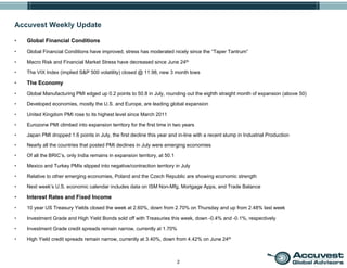 The document provides a weekly summary of global financial conditions and markets. It notes that global financial stress has decreased since late June and global manufacturing PMIs edged up in July. The US and Europe are leading global economic expansion. US stock markets hit new highs in July on strong economic data despite little earnings growth. Commodity prices remain in a downtrend but have made higher lows recently.