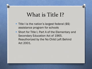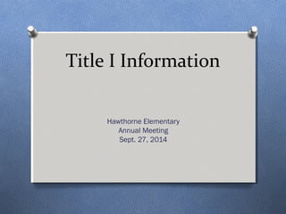 Title I is a federal program that provides financial assistance to schools with high percentages of children from low-income families to help ensure all children meet state academic standards. At Hawthorne Elementary, Title I funds are used to lower class sizes, provide programs for English language learners, hire intervention teachers for reading and math, and offer professional development for teachers. The goal of these programs is to improve instruction and help students, especially those struggling in certain subjects, achieve academic success.