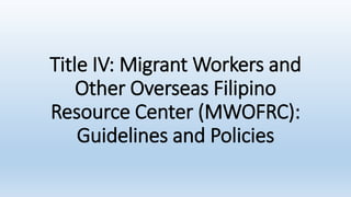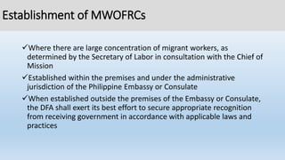 The document outlines guidelines and policies for Migrant Workers and Other Overseas Filipino Resource Centers (MWOFRCs). MWOFRCs are established within Philippine embassies or consulates in areas with large concentrations of migrant workers, as determined by the Secretary of Labor. Services provided at MWOFRCs include counseling, legal assistance, welfare services, registration of irregular workers, and implementing programs from the Department of Labor and Employment and Overseas Workers Welfare Administration. Personnel at MWOFRCs include foreign service personnel, labor attaches, psychologists, social workers, and representatives from NGOs. MWOFRCs are used as venues for meetings, trainings, and temporary shelters for migrant workers in distress