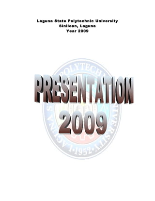 Laguna State Polytechnic University is located in Siniloan, Laguna. It is a state university that provides higher education. The document appears to be from the university and is dated 2009.