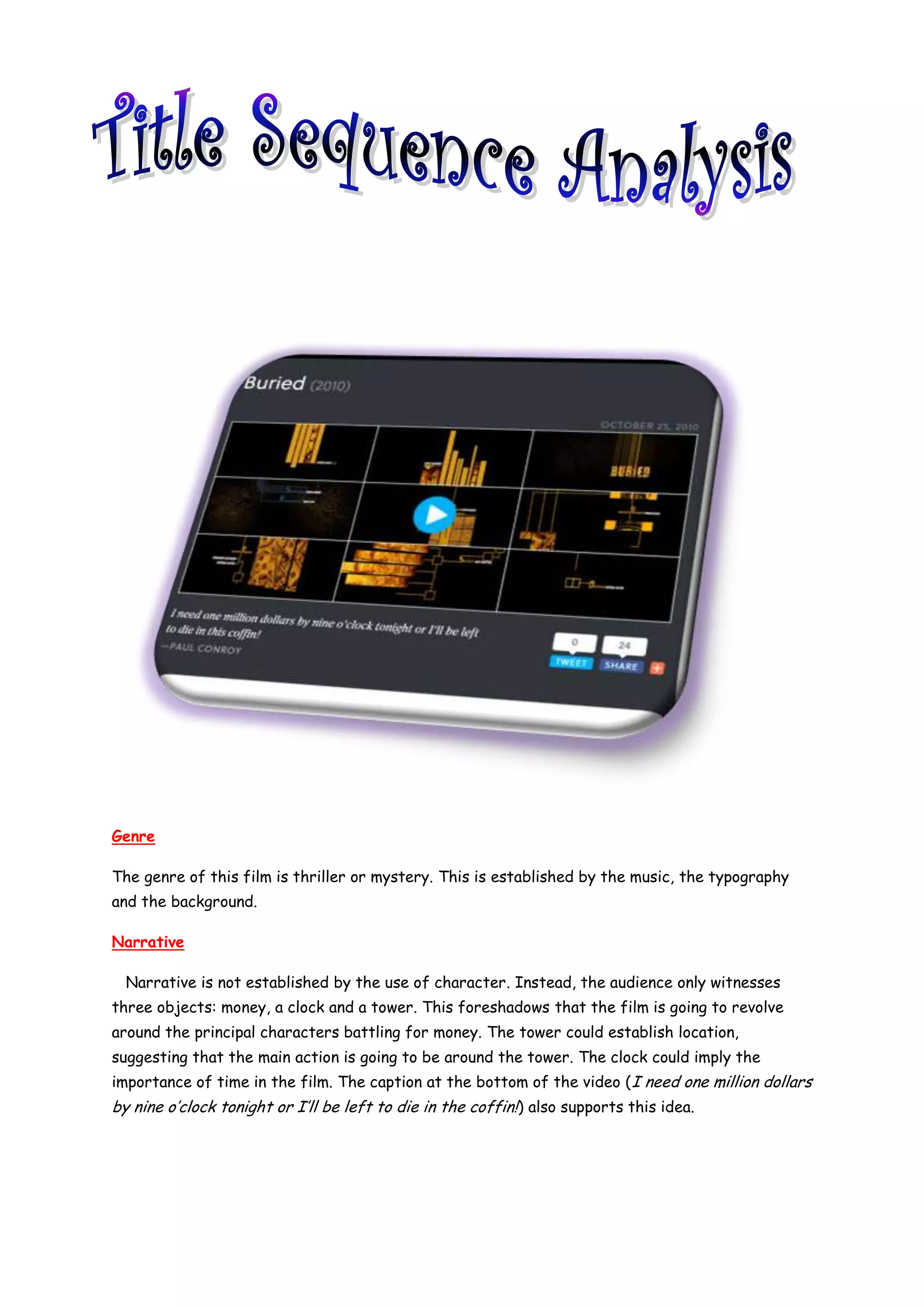 The genre of the film is a thriller or mystery, as established by the ominous music, typography, and underground setting shown. The narrative focuses on three objects - money, a clock, and a tower - which foreshadows a story about characters battling over money with the clock implying the importance of time. The atmosphere is set as tense and dramatic by the unsettling music that builds in volume and tempo. The typography used for the title and job roles enhances the underground theme. The camerawork in the animation shows the titles appearing and disappearing into the ground to get buried, with split images of the clock, tower, and money. The target audience is very wide as there is nothing inappropriate for children.