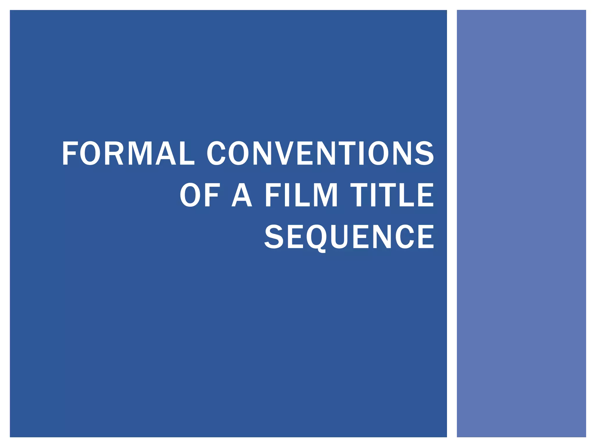 The document discusses the formal conventions of a film title sequence. It explains that a title sequence usually lasts 2-5 minutes and introduces the main production credits using three common styles: montage, narrative, or conceptual. The standard order of credits is production company, director, producer, main actors/actresses, film name, and remaining crew. Two examples, Juno and Se7en, follow the conventions while Spiderman 3 switches some elements like showing the film name before the director/producer credits. All three examples feature non-diegetic sound.