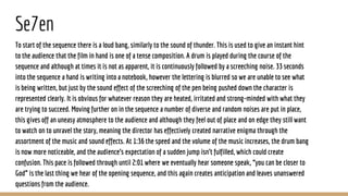 The title sequences of Se7en, Panic Room, and The Girl with the Dragon Tattoo use visuals and music to set the tone and build anticipation for each film. Se7en's sequence uses sounds of thunder, drums, and screeching to create an uneasy atmosphere. Panic Room's titles focus on the aesthetics of the city skyline and use music to convey the thriller genre. The Girl with the Dragon Tattoo opens with the song "Immigrant Song" to set a mysterious, fast-paced tone, and uses dark colors, fire, and quick cuts between odd images to intrigue viewers about the film's events.