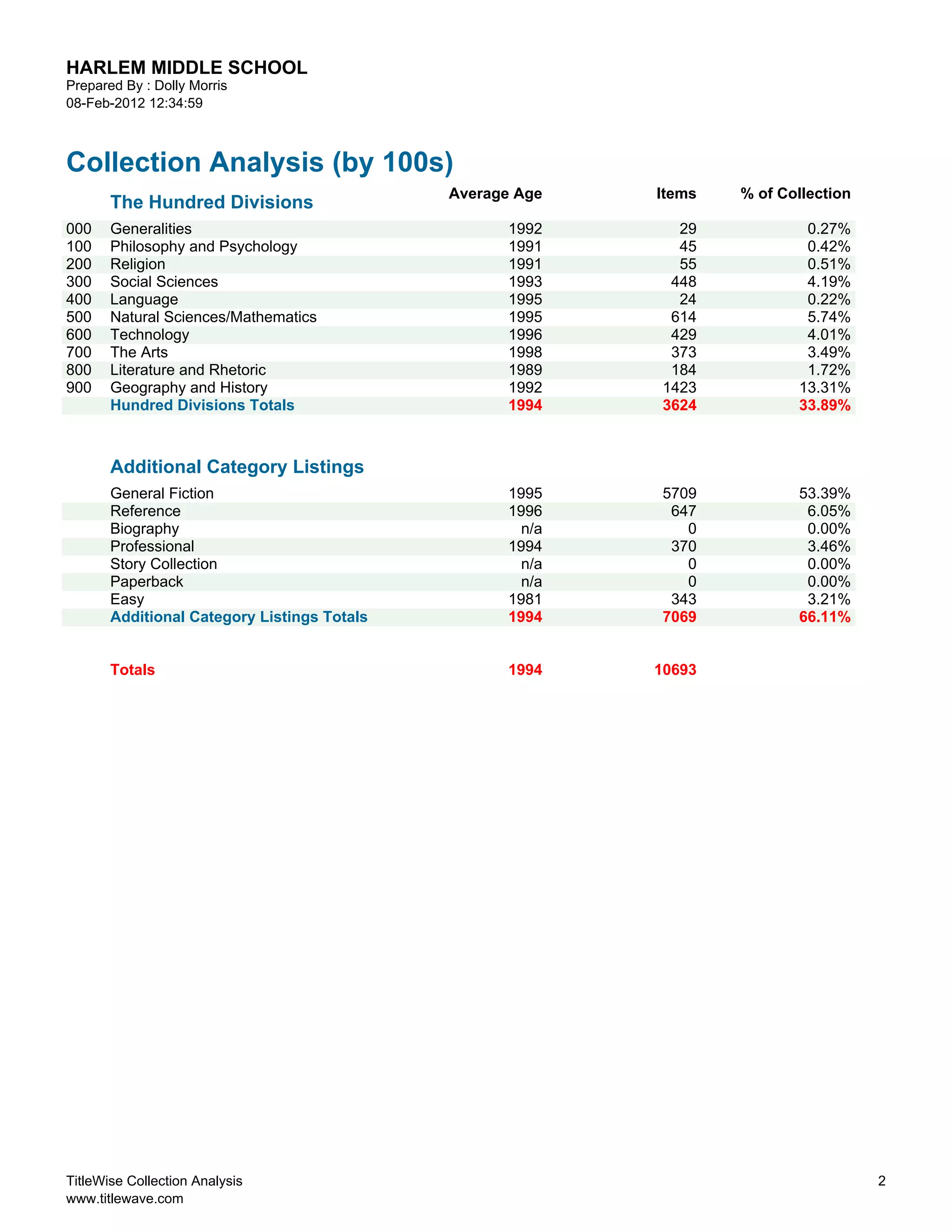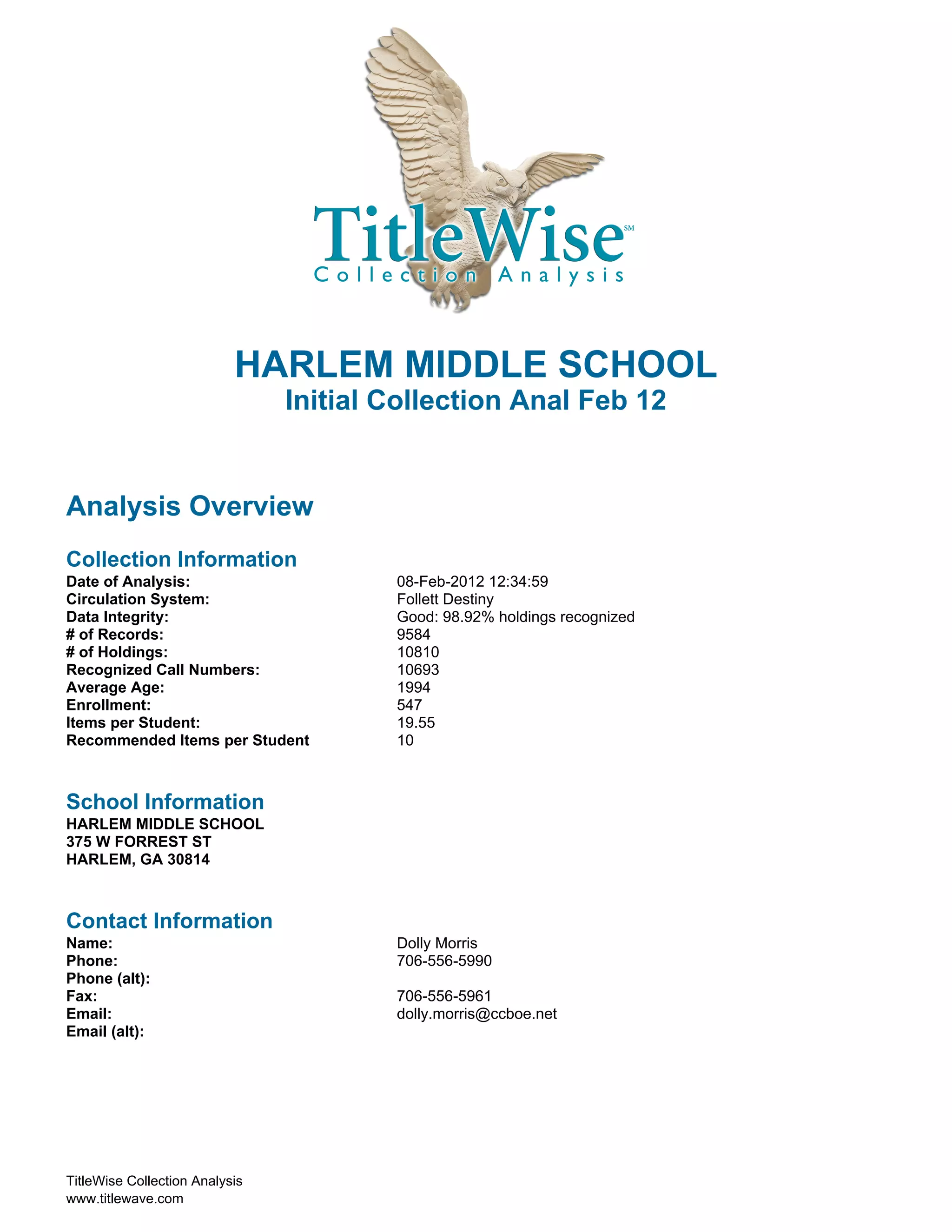 This document provides an analysis of the collection at Harlem Middle School in Harlem, GA. It finds that the collection has 9,584 records and 10,810 holdings. The average age of items is 1994. General fiction makes up 53.39% of the collection, which exceeds the recommended 25% benchmark. The social sciences category is underrepresented at 4.19% compared to the recommended 11%. The analysis also provides details on the school information, contact information, and breakdown of the collection by Dewey decimal categories.