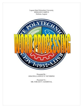 This document is from Laguna State Polytechnic University's Siniloan campus and was presented by Graciella Joyce N. Victorino to Mr. For-Ian V. Sandoval. The document appears to be a presentation or report submitted by a student named Graciella Joyce N. Victorino to an assistant named Mr. For-Ian V. Sandoval from the Siniloan campus of Laguna State Polytechnic University.