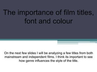 The document discusses how film titles use font, color, and design to represent the genre and tone of different movies. It provides examples of titles for sci-fi, crime, action, comedy, biography, and animation films. The fonts and designs are chosen to suit the style of each film and capture its mood. Titles for similar romance or drama genres also use simple, clear fonts in calming colors to represent themes of escape or new beginnings. Handwritten fonts can make titles feel more personal for films connected to diaries or a protagonist's spirit.