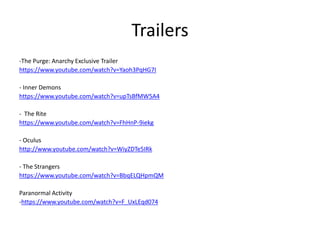 This document discusses various elements that appear in movie trailers such as titles, credits, quotes and their purpose. Titles are usually placed towards the end of trailers to leave a lasting impression. Credits include names of actors, directors and producers to attract audiences. Quotes are used to create thrills and fit the horror genre. Social media links appear at the very end for marketing purposes. Credits are placed throughout trailers in a non-linear way and include production companies. Elements like titles and credits are designed to fit the genre through colors, fonts and effects.