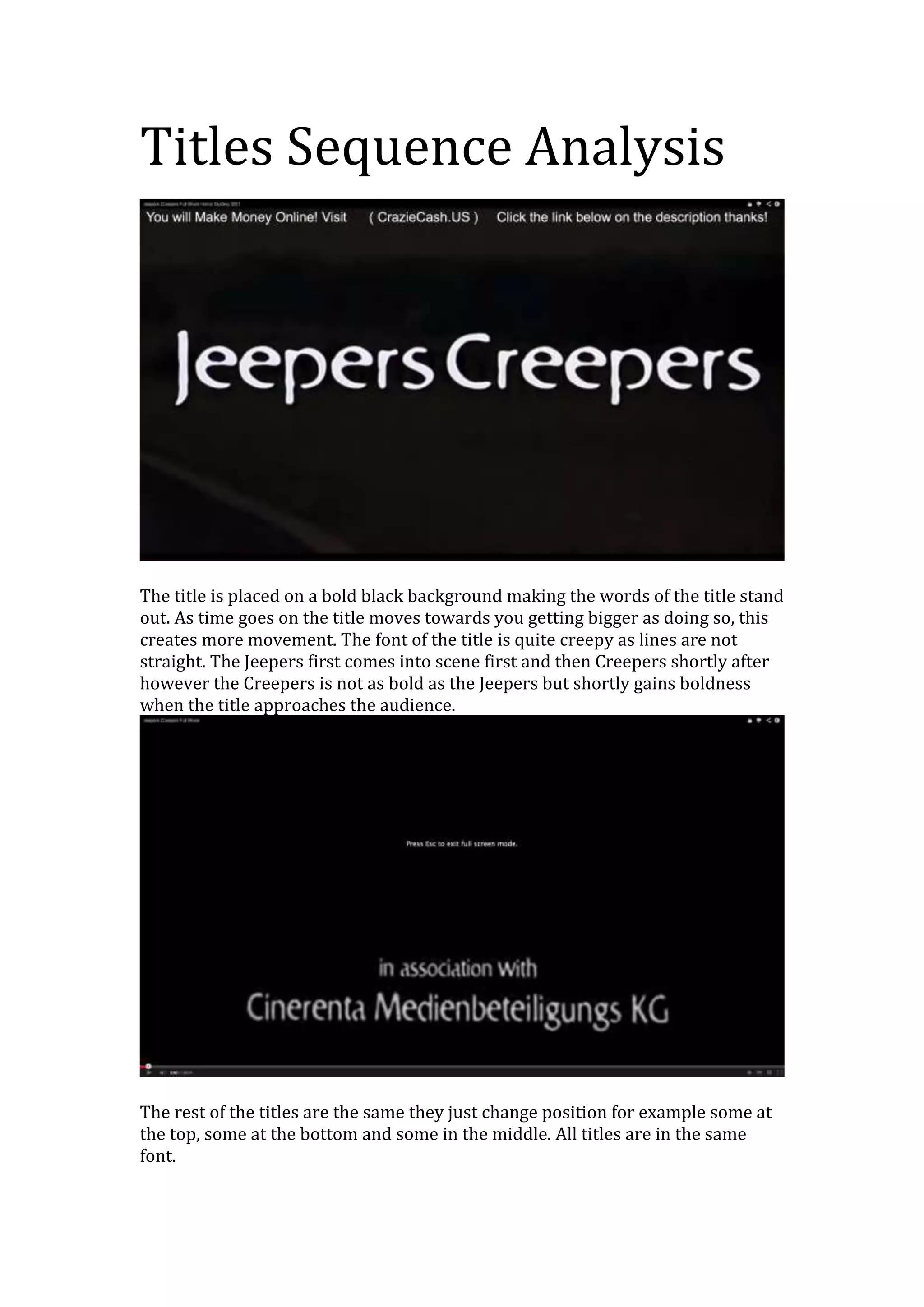 The document summarizes and provides descriptions of the title sequences from various films. It discusses elements like backgrounds, fonts, colors, and movements used in the titles. Specific sequences mentioned include "Jeepers Creepers" with a bold black title that gets bigger as it moves towards the audience, "Psychopath" with a creepy silhouette background, and "While the Children Sleep" with a yellow title in a 3D font over a normal scene.