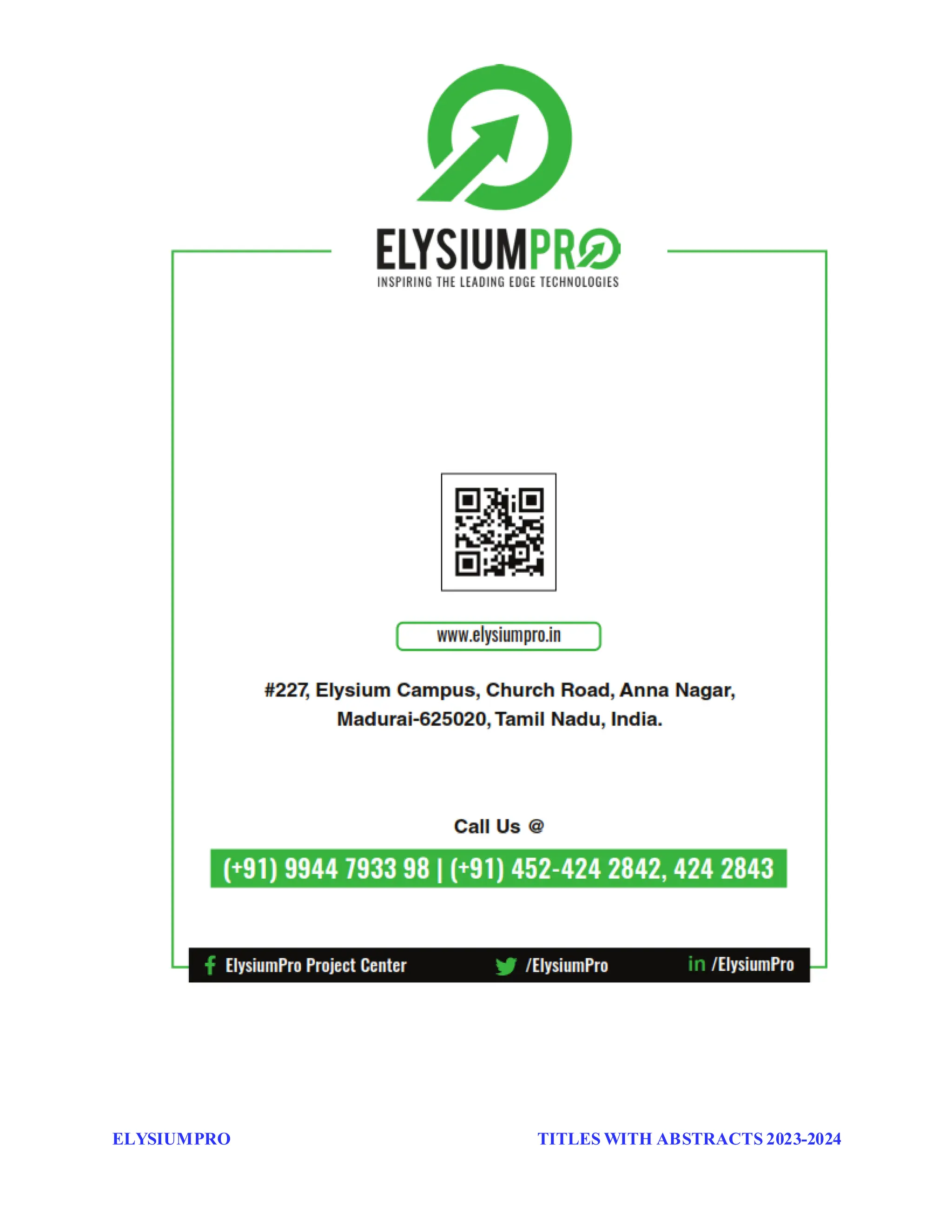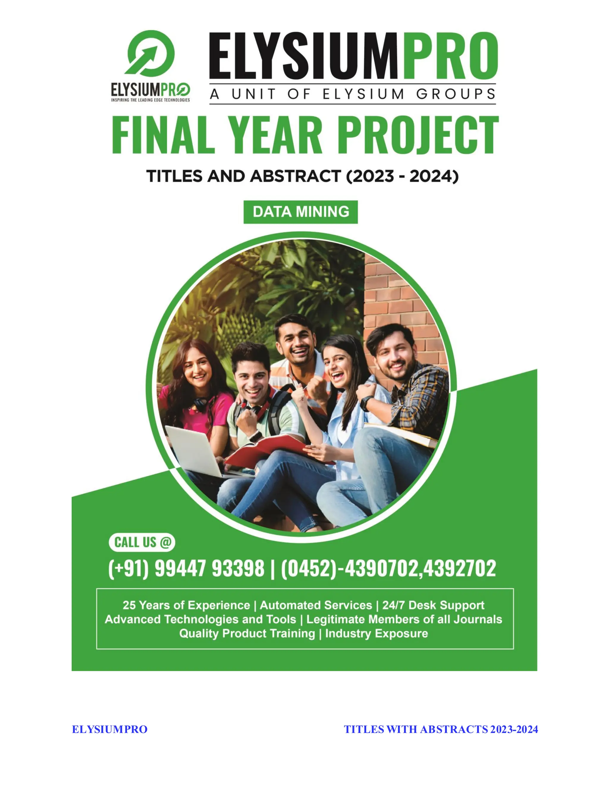 The document outlines various research projects in cybersecurity, healthcare, machine learning, and big data from the elysiumpro titles with abstracts for 2023-2024. Each project focuses on addressing specific challenges such as phishing detection, diabetes monitoring, intrusion detection in IoT, credit card fraud, and more, employing advanced techniques like machine learning and cloud computing. The studies aim to enhance security, improve healthcare outcomes, and develop effective data management solutions across multiple domains.