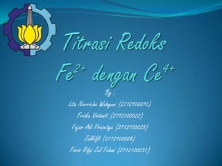 Titrasi redoks adalah titrasi antara analit dan titran yang melibatkan reaksi redoks. Terdapat beberapa jenis titrasi redoks seperti permanganometri, dikromatometri, dan cerimetri. Titrasi redoks memerlukan syarat tertentu seperti hanya satu reaksi yang terjadi pada titik ekivalensi dan adanya indikator. Contoh soal titrasi redoks larutan besi(II) dengan serium(