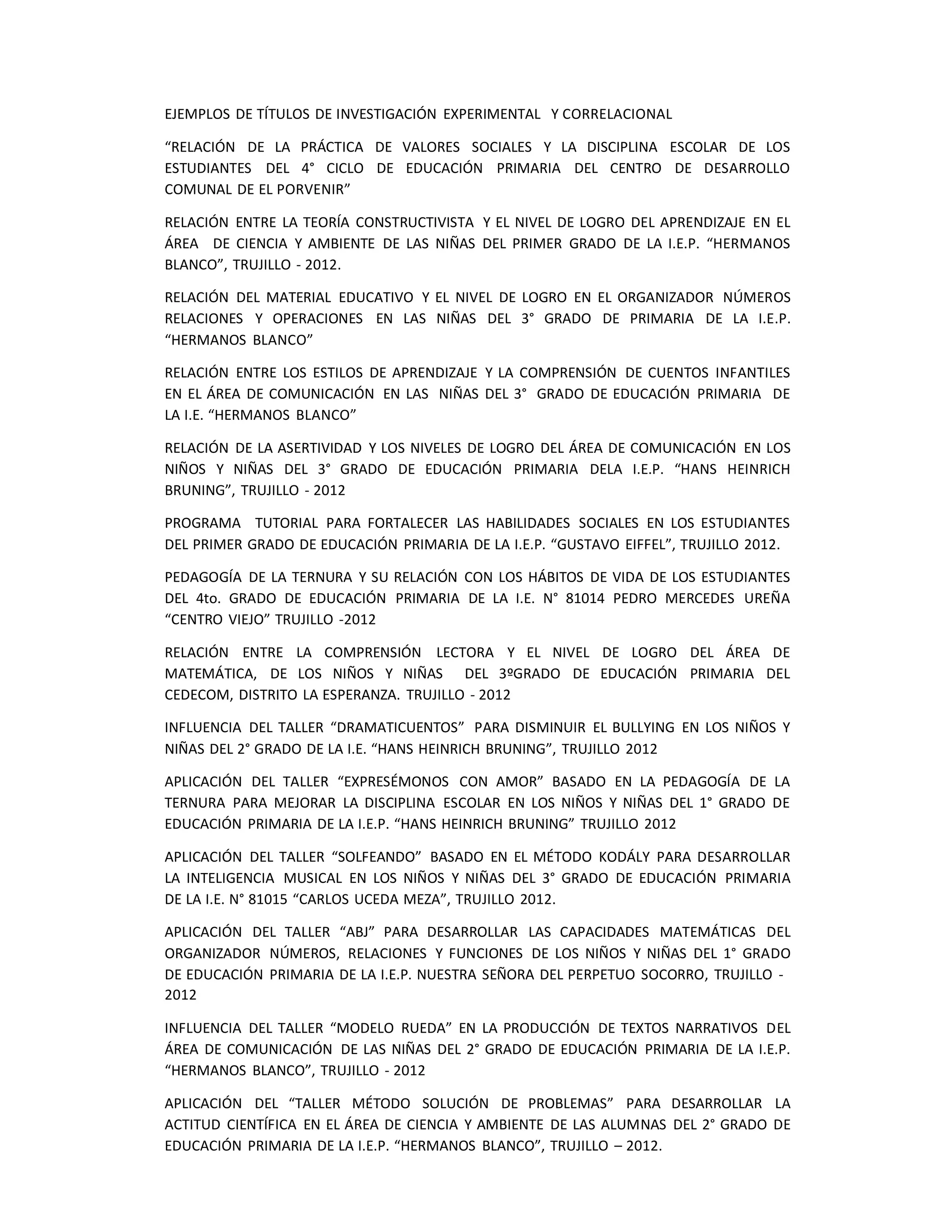 Este documento presenta una lista de títulos de investigaciones educativas realizadas en Trujillo, Perú entre los años 2012 y 2013. Los títulos se refieren principalmente a estudios correlacionales sobre la relación entre diversos factores psicosociales, pedagógicos y contextuales con el rendimiento y logro académico de estudiantes de educación primaria y secundaria. Algunos títulos también describen la aplicación y evaluación de talleres y programas educativos diseñados para mejorar habilidades en áreas como comunicación, mate