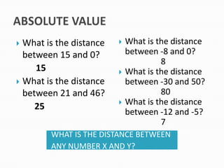 1) How to calculate the distance between two numbers by taking the absolute value of their difference.