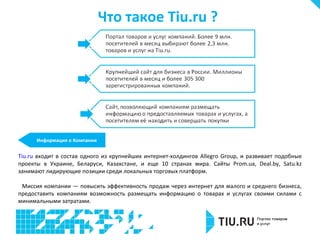 Документ представляет собой презентацию рекламных возможностей портала tiu.ru, который является частью интернет-холдинга Allegro Group и активно развивает проекты в нескольких странах. Тiu.ru занимает высокие позиции в интернет-рейтингах и предлагает бизнесу эффективные решения для продаж через интернет. Аудитория сайта превышает 12 миллионов посетителей в год, а эффективность рекламных размещений обеспечивается уникальными форматами и высокими показателями вовлеченности пользователей.