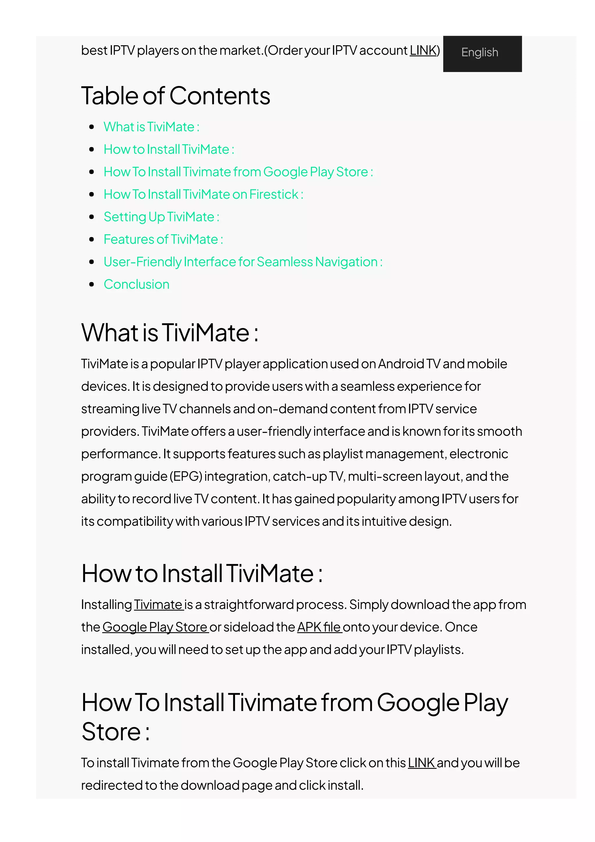 The document outlines the installation process for Tivimate, a popular IPTV player for Android devices and Fire TV, highlighting its user-friendly interface and advanced features for streaming live TV and managing playlists. It details steps for installation via the Google Play Store and sideloading on Firestick, along with setup tips for IPTV subscriptions. Key features include live TV streaming, recording capabilities, catch-up TV, and a customizable interface, making Tivimate a comprehensive solution for IPTV users.