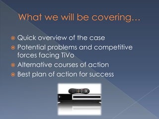 TiVo allows users to pause, rewind and record live TV and faces challenges in gaining widespread adoption. The document analyzes TiVo's business model and competitive threats. It recommends that TiVo lower prices to attract mainstream consumers, emphasize the pause and recording features in stores, and partner with TV providers to boost exposure and sales.