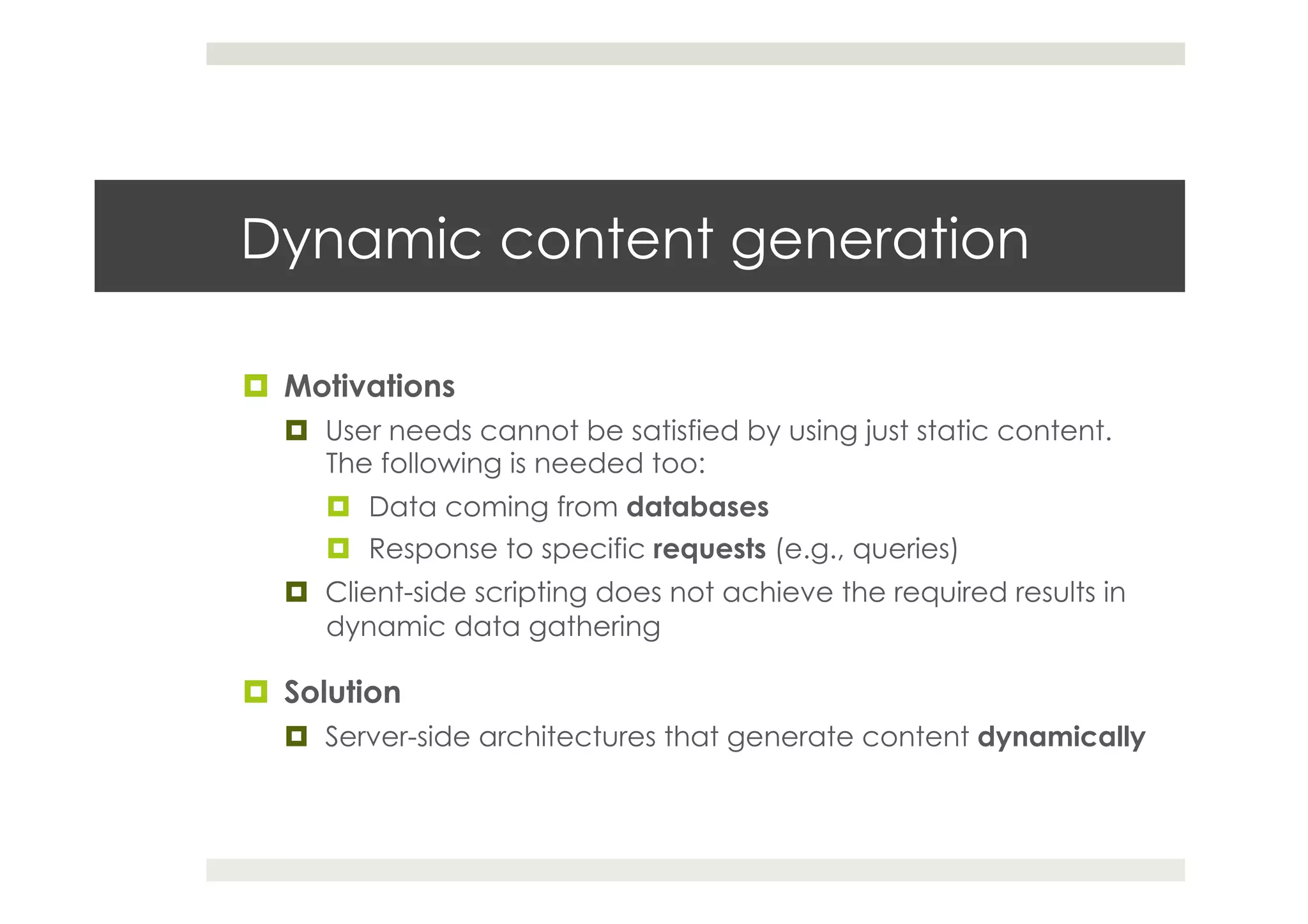 - Dynamic content generation is needed to satisfy user needs that cannot be met with static content alone, such as data from databases or responses to queries. This requires server-side architectures that dynamically generate content.
