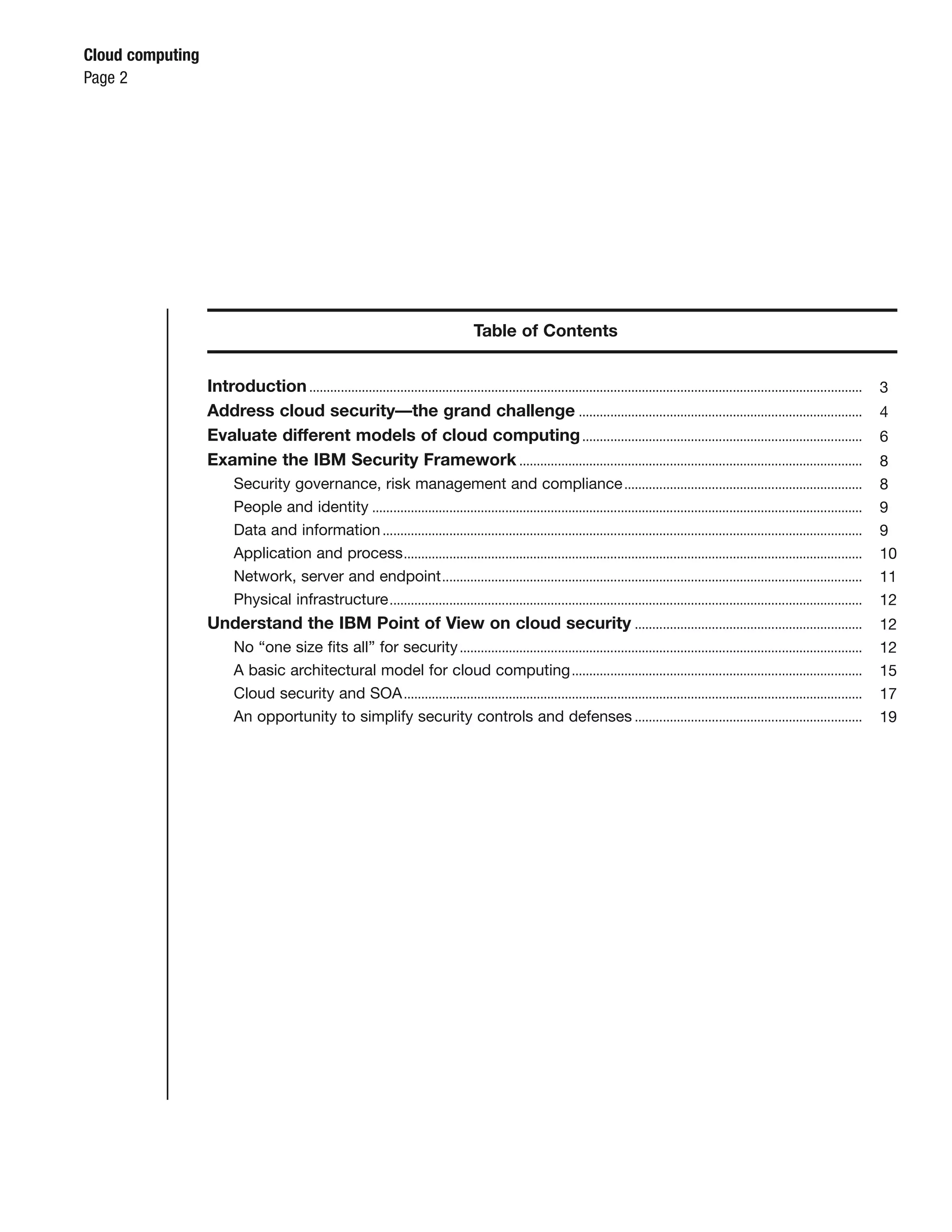 The document from IBM discusses cloud computing's security challenges and frameworks, emphasizing the need for tailored security measures based on specific organizational requirements. It covers the various models of cloud computing, such as SaaS, PaaS, and IaaS, highlighting the responsibilities of both providers and clients in maintaining security and compliance. The paper stresses the importance of establishing trust relationships between clients and providers, as well as implementing robust governance and risk management practices for secure cloud operations.