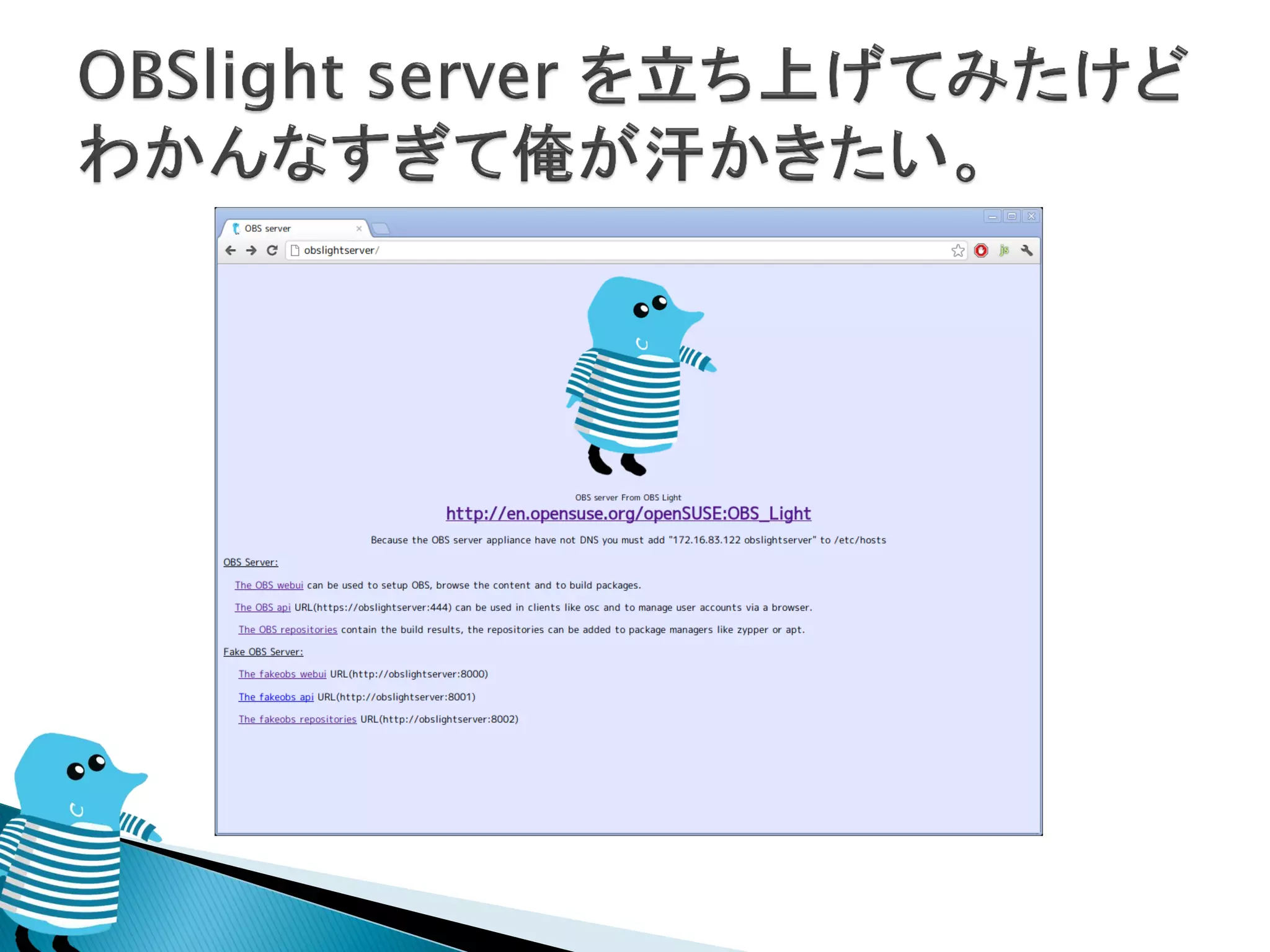 パッケージを作成するデーモンサービス サーバにビルドを依頼できる…らしい OBS Server のイメージは以下 ◦ http://susestudio.com/a/e0uuBG/obs-obs-server- obs-light OBSlight(クライアント?)のインストール方法は以下 ◦ http://en.opensuse.org/openSUSE:OBS_Light_Install ation