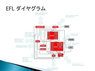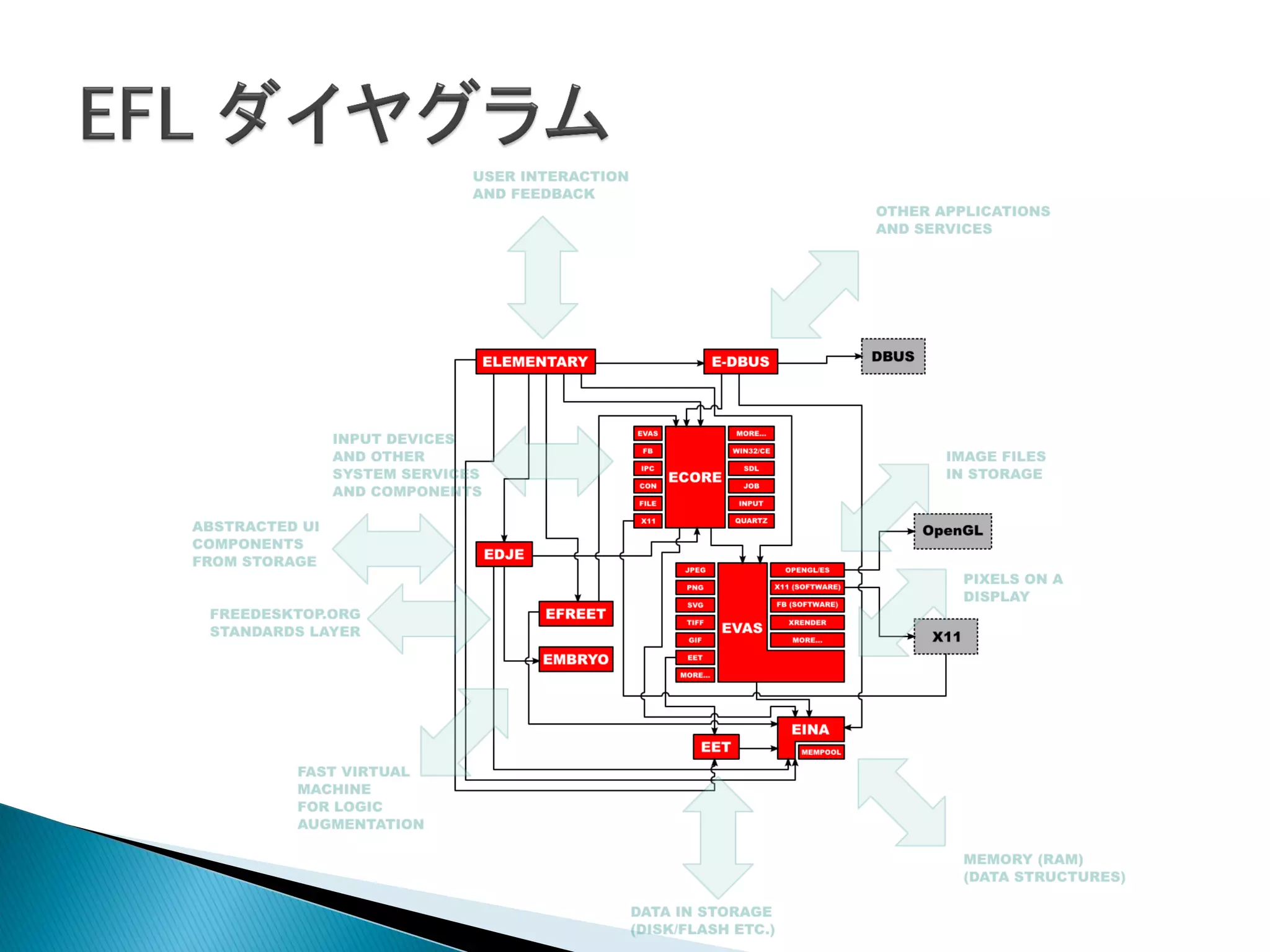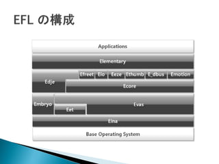 Enlightenment Foundation Libraries の略 Enlightenment DR17 のために作成 開発期間は 13,4年(!) 近々 EFL 1.7 をリリース予定。 ◦ (※) Enlightenment DR17 はまだリリースされてない。 小粒なライブラリが階層を成しています。 ◦ Eina – データ構造ライブラリ ◦ Eet - ストレージライブラリ ◦ Evas - キャンバスライブラリ ◦ Ecore - メインループライブラリ 省メモリ ◦ EFL のメモリ使用量は Qt の ¼, GTK の ½