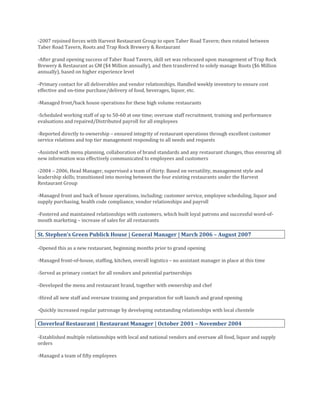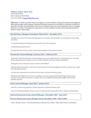 TJ Egan is seeking a new position where he can apply his management and problem solving skills. He has over 15 years of experience in restaurant and hospitality management, including as general manager of several establishments. His experience includes overseeing all aspects of operations, staffing, inventory, and vendor relationships. He is skilled in training employees, increasing sales and profitability, and providing excellent customer service.