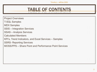 This document provides samples of code and projects related to Microsoft SQL Server business intelligence technologies including T-SQL, MDX, SSIS, SSAS, SSRS and SharePoint. It includes T-SQL code samples, an SSIS project overview, diagrams and explanations of an SSAS cube design, examples of KPIs and MDX queries, and summaries of using Excel and SSRS with SSAS data. The samples and projects are intended to demonstrate the author's skills and experience with various Microsoft BI technologies.