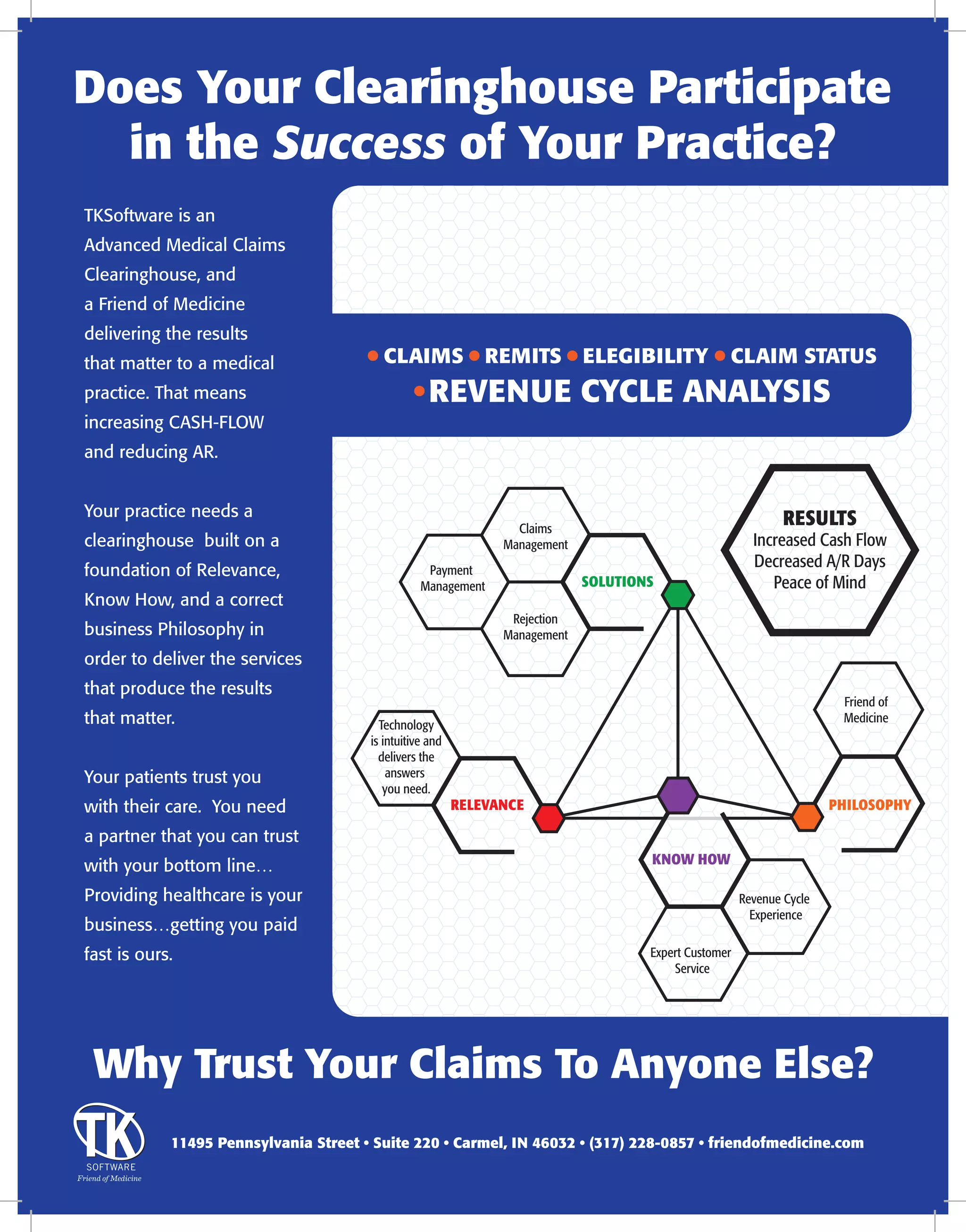 tksoftware is a medical claims clearinghouse focused on improving cash flow and reducing accounts receivable for medical practices. It emphasizes the importance of trust and relevance in its services, aiming to support healthcare providers in getting paid quickly. The company's philosophy aligns with the needs of medical practices, making it a reliable partner in the business of healthcare.
