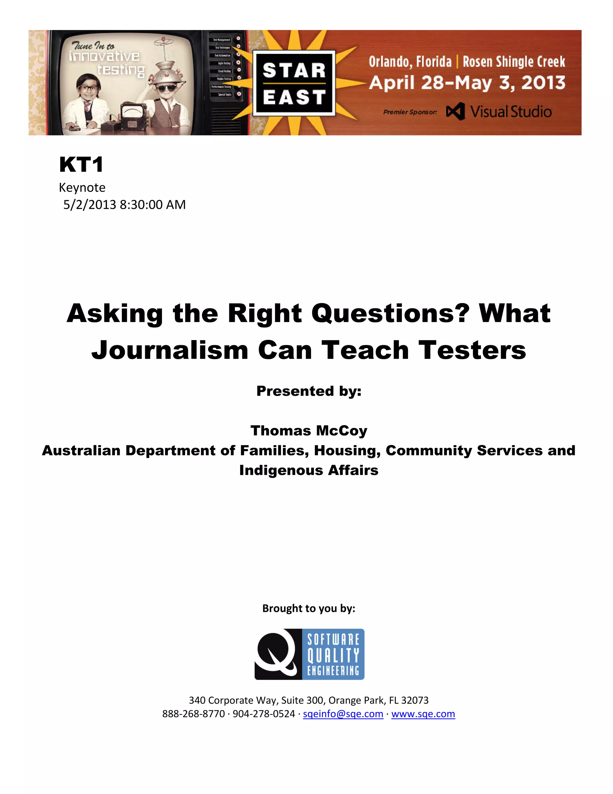 Thomas McCoy, an experienced IT professional from Australia, discusses the parallels between journalism and software testing in his keynote presentation at Star East 2013. He emphasizes critical communication skills, the importance of questioning, and the ethical considerations inherent in both fields. McCoy argues that software testing can be viewed not just as a job but as a vocation with a social responsibility, akin to journalism.